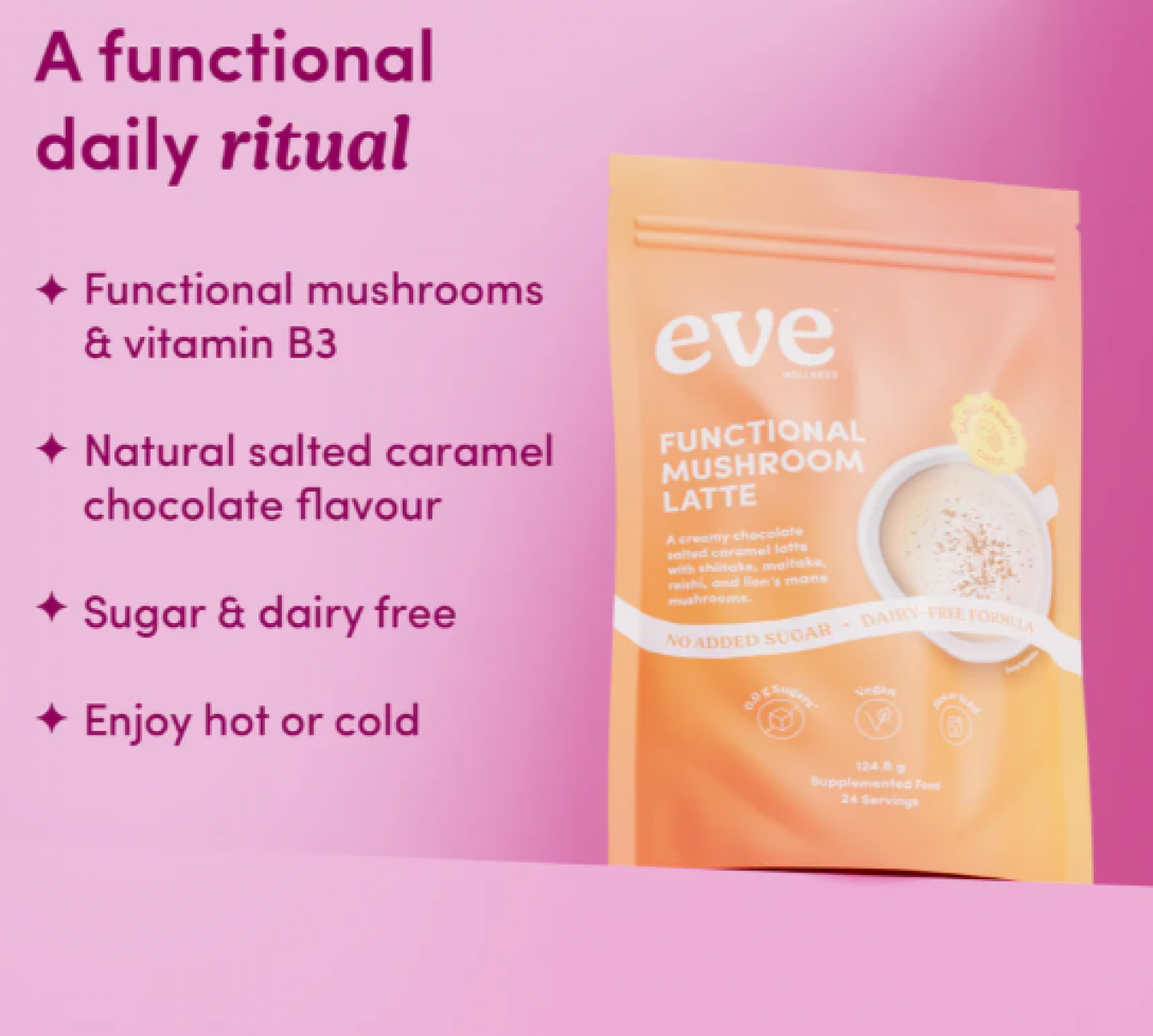 Salted caramel chocolate meets wellness, with Lion’s Mane, Reishi, Maitake, and Shiitake mushrooms blended for benefits that go way beyond flavour. Enriched with Vitamin B3, it supports neurological function and helps combat fatigue, keeping your mind sharp and your body fuelled with every sip.